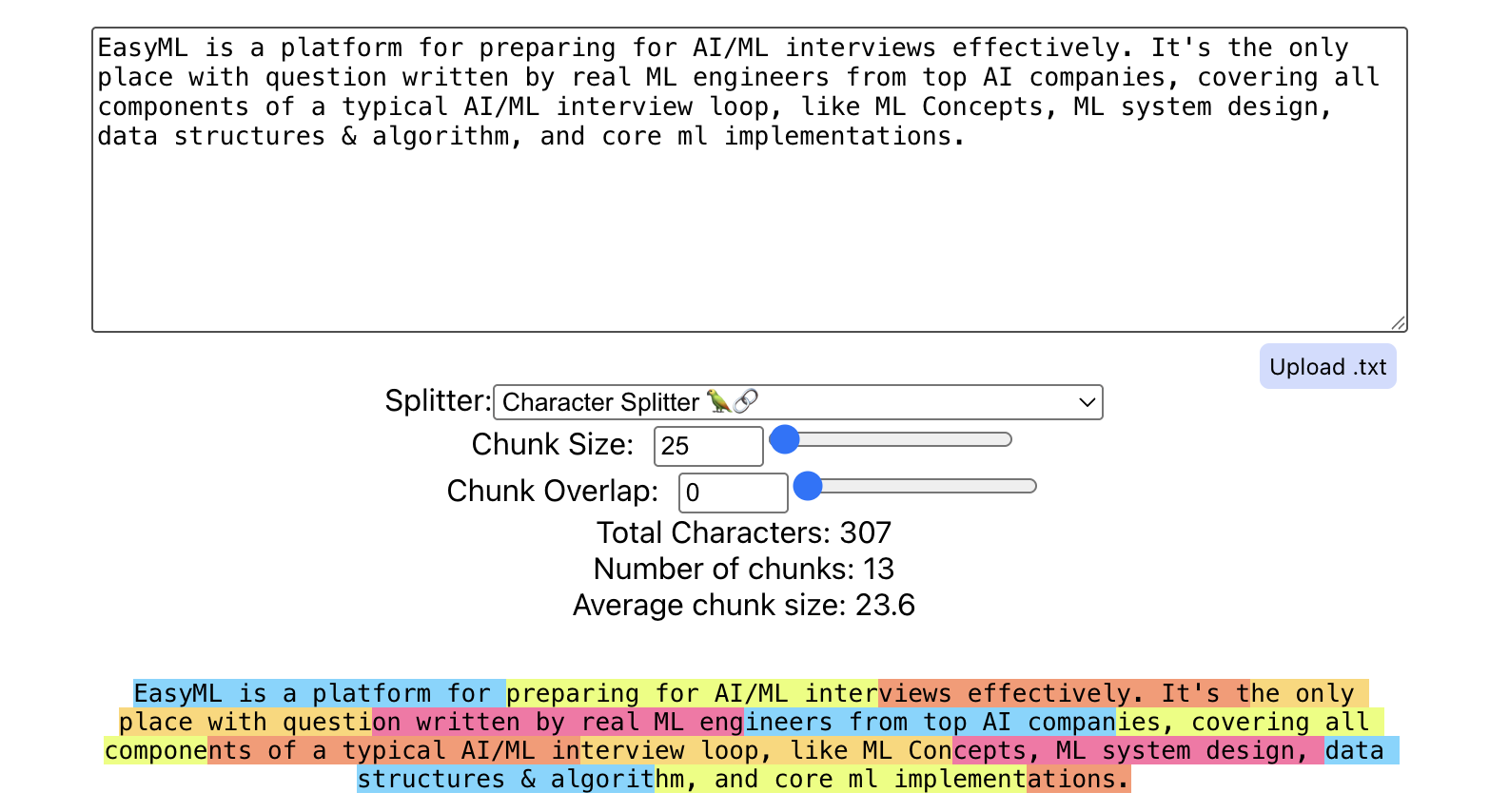 The goal of document chunking is to work around these limitations by breaking our text data into smaller chunks of data. Each chunk will be vectorized and stored in a database, acting as its own atomic unit of information available for retrieval. In doing so, we can not only reduce memory constraints, but allow for more precise, higher-quality retrieval! Below is an example of chunking text about mlprep (this very site!) using Greg Kamradt's ChunkViz: