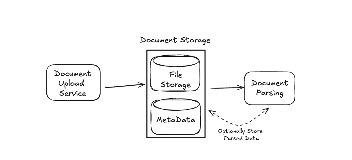 As an obvious first step, we'll need to store any uploaded documents. Assuming these are standard PDF files, we can store the raw documents in some object storage (e.g. S3, GCS, etc.). We may also want to store some basic metadata for these files (filename, size, type, upload time). Our basic metadata document store may have a schema as follows: